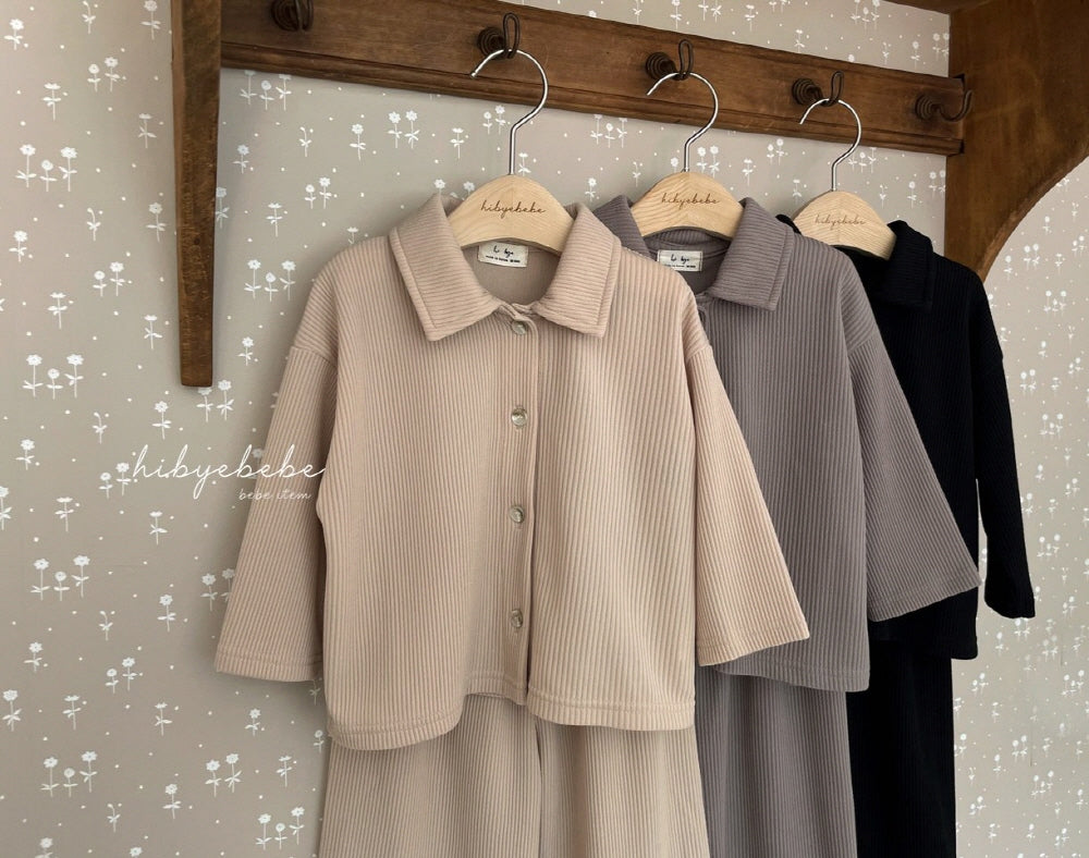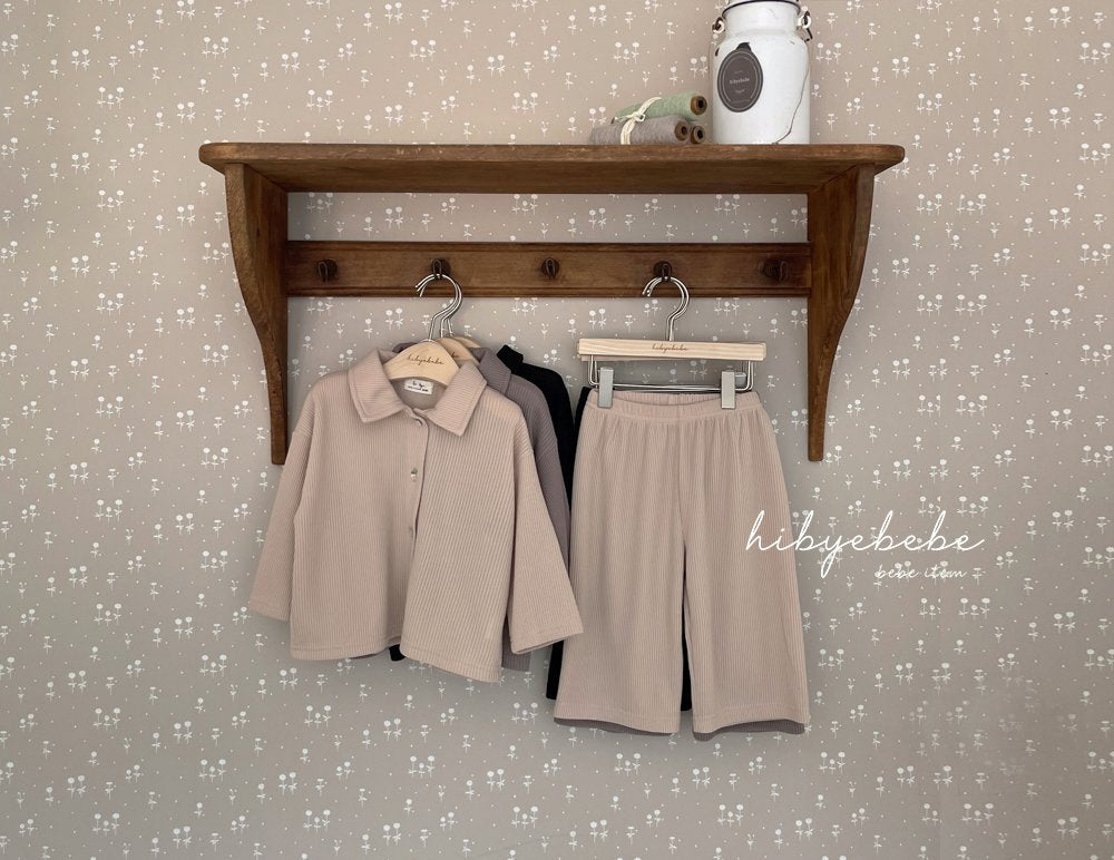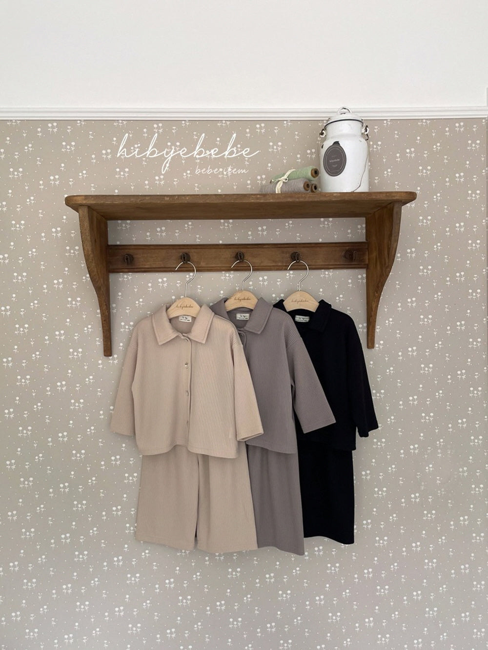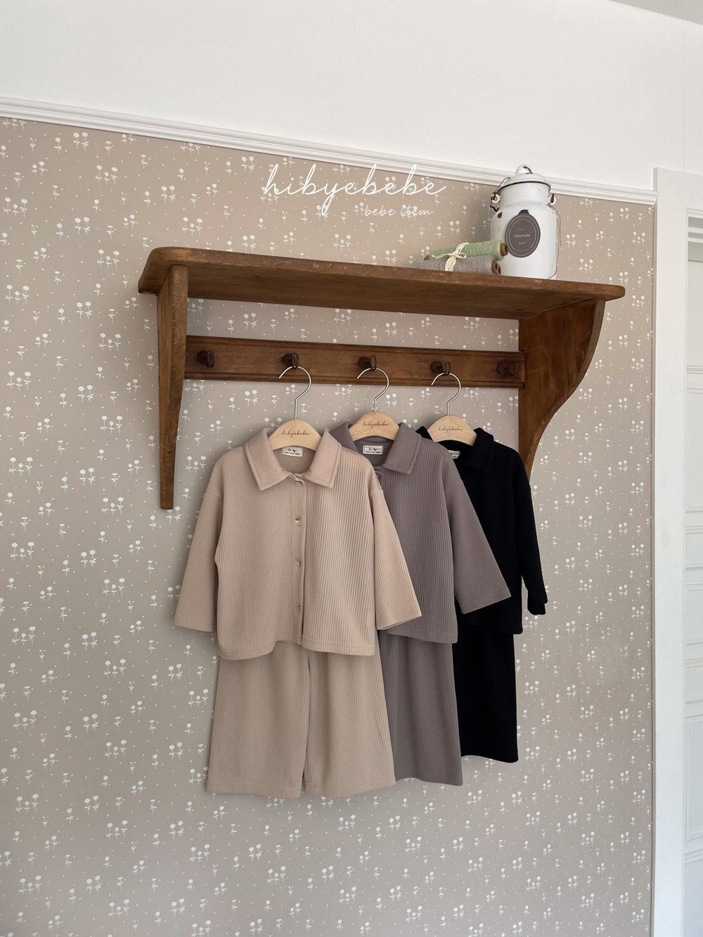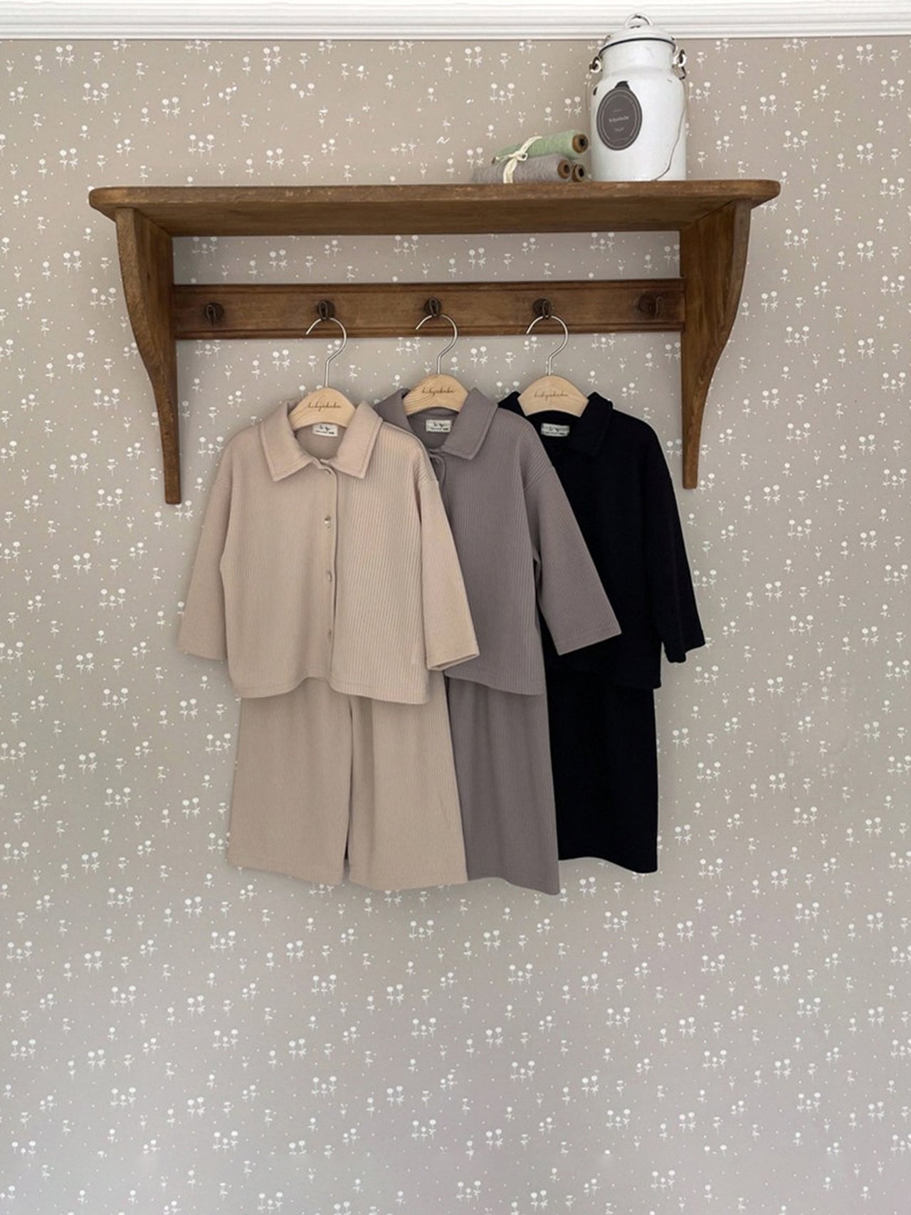 Basic and comfy collar top and bottom set for little ones. Semi-cropped length.